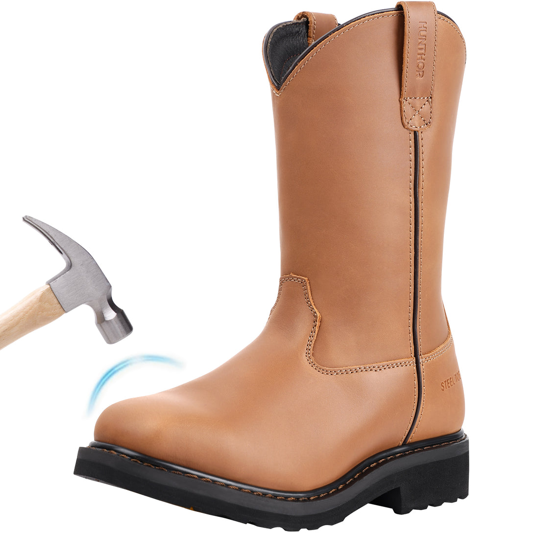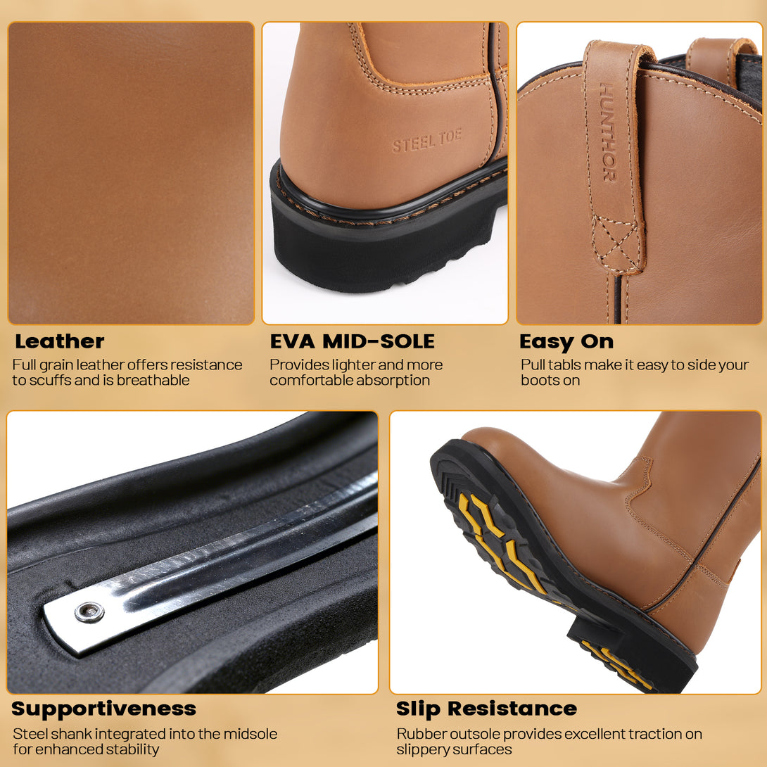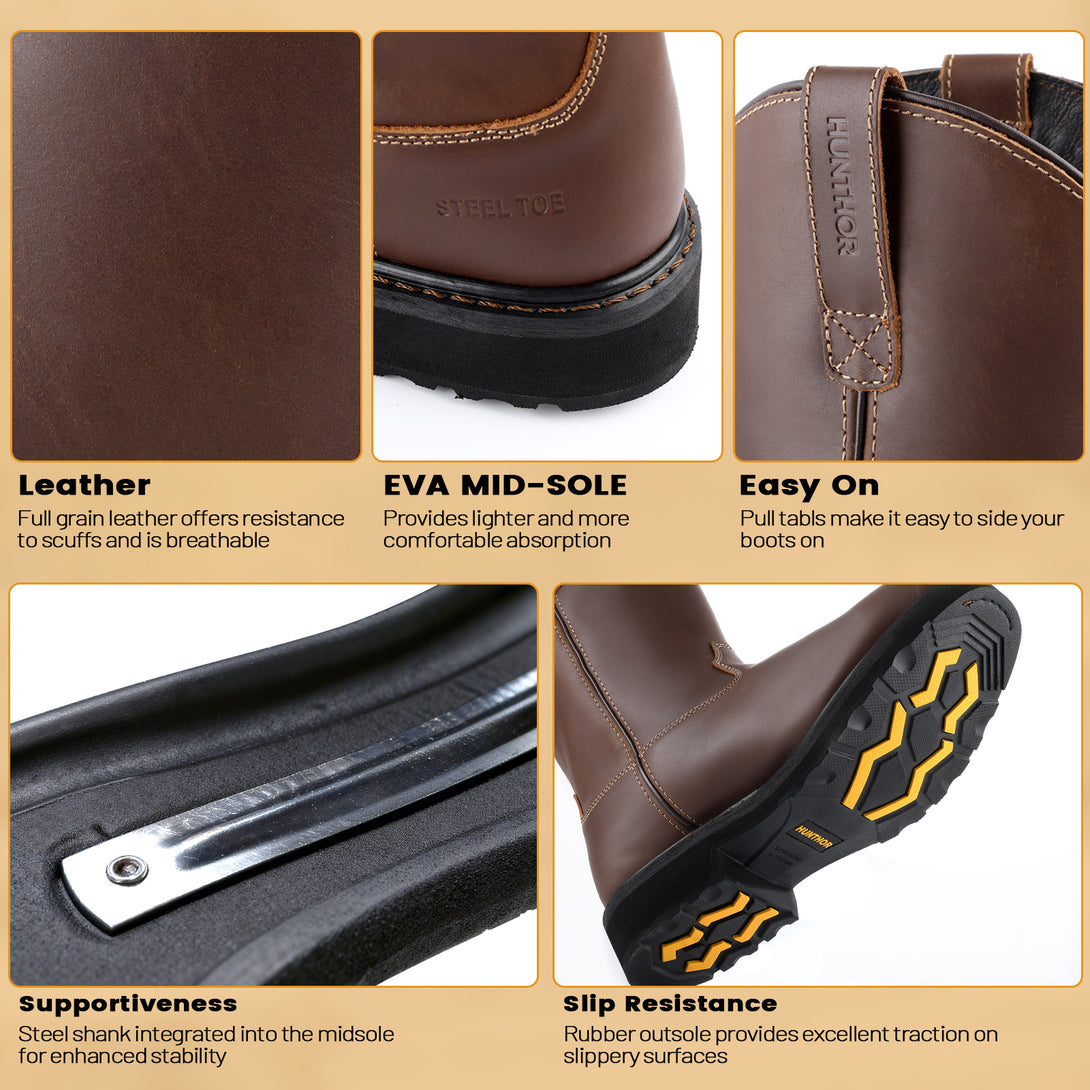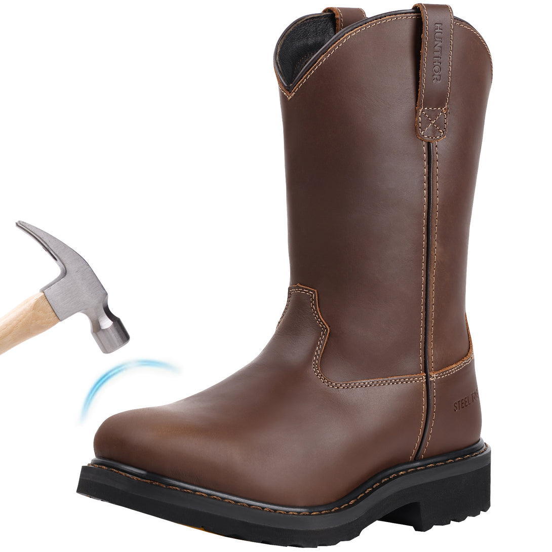 Steel Toe Work Boots for Men - Puncture Proof with Steel Shank, Slip On GoodyearWelt, Full-Grain Leather, Oil & Slip Resistant, Pull-On Wellington Design - Ideal for Construction, Farming (Size, 7-14)