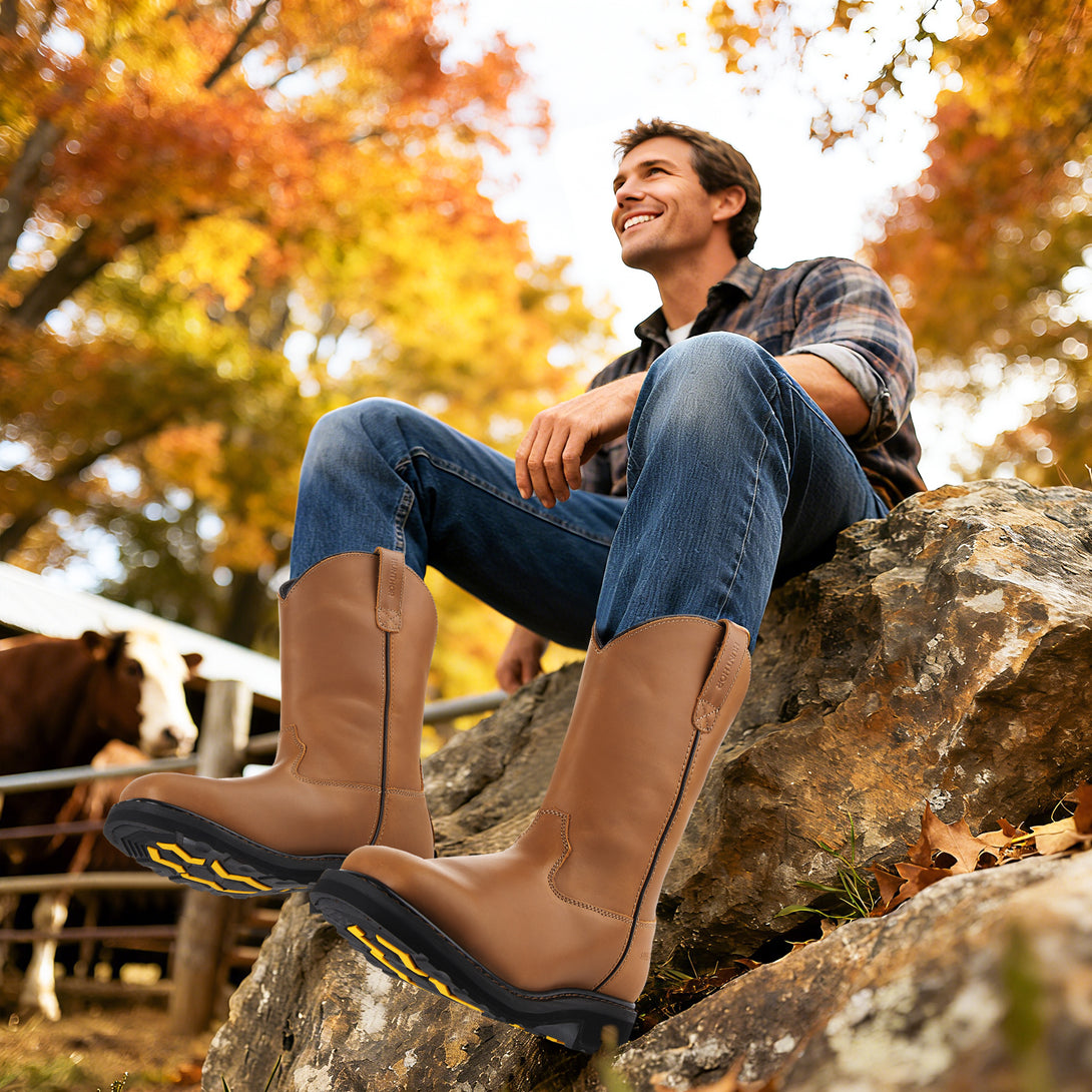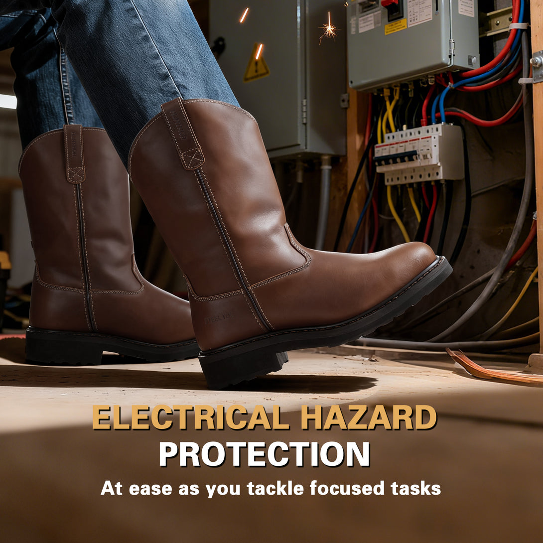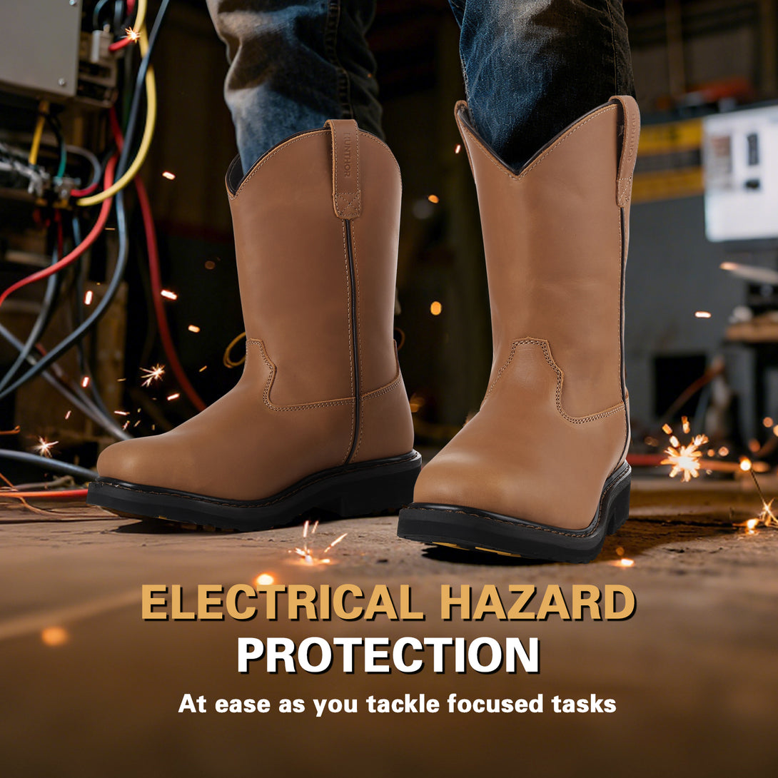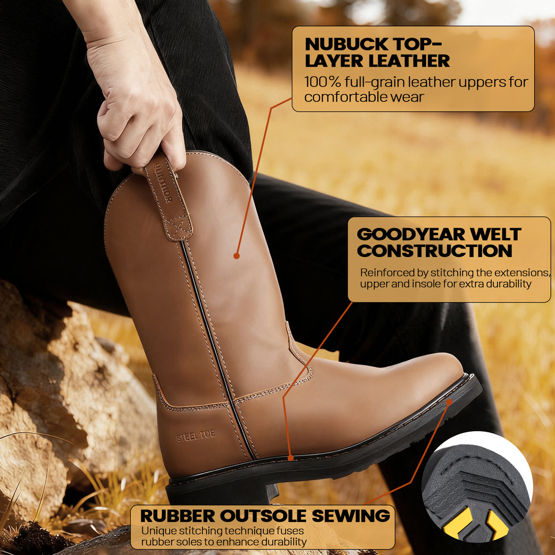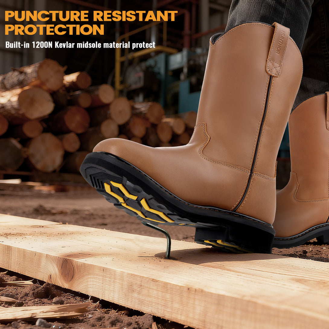 Steel Toe Work Boots for Men - Puncture Proof with Steel Shank, Slip On GoodyearWelt, Full-Grain Leather, Oil & Slip Resistant, Pull-On Wellington Design - Ideal for Construction, Farming (Size, 7-14)