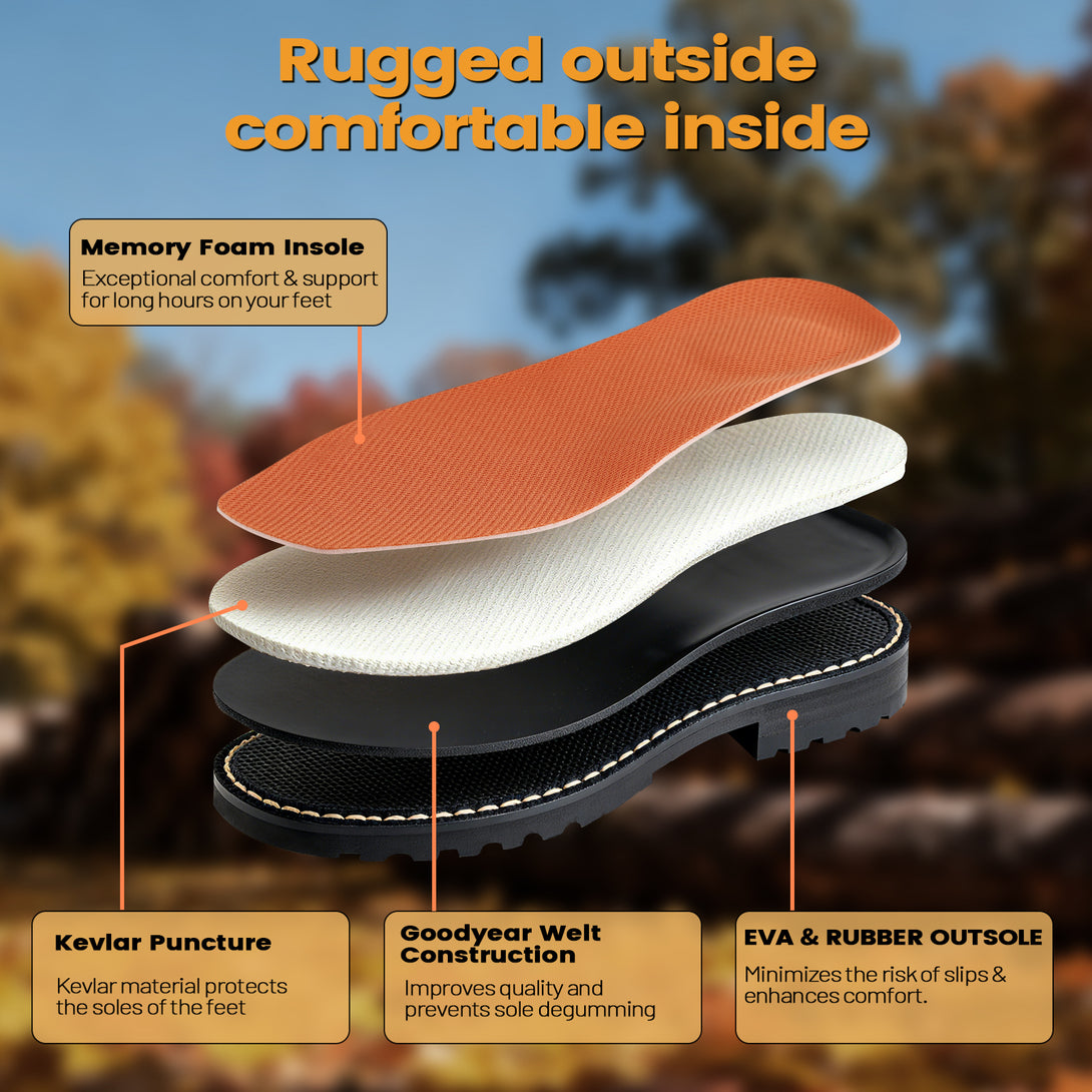 Anti-Slip & Comfort: The rubber anti-slip outsole and EVA footbed in slip on work boots provide cushioning and support, reducing muscle fatigue and discomfort in feet and legs